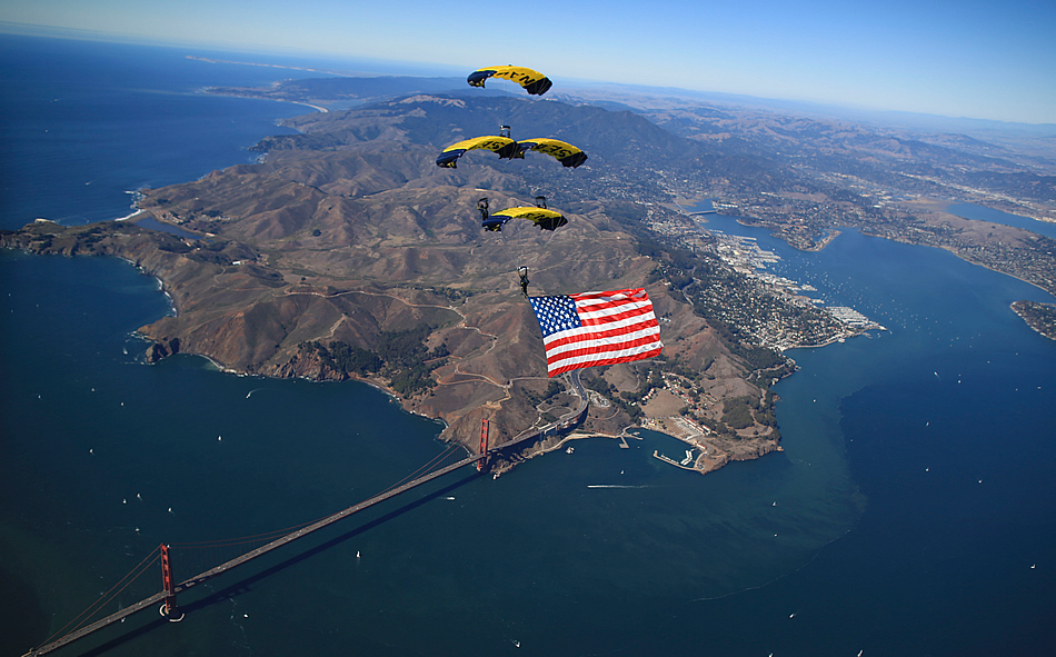 SAN FRANCISCO (Oct. 9, 2015) Members of the U.S. Navy Parachute Team, the Leap Frogs, perform a diamond formation during a skydiving demonstration at the San Francisco Fleet Week Air Show. The Navy Parachute Team is based in San Diego and performs aerial parachute demonstrations around the nation in support of Naval Special Warfare and Navy recruiting. (U.S. Navy photo by James Woods)