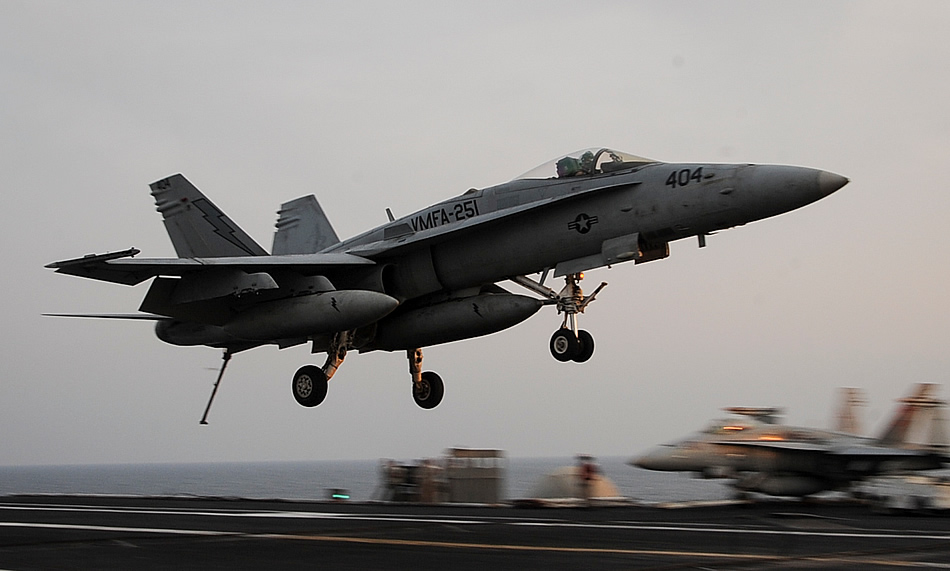 U.S. 5TH FLEET AREA OF OPERATIONS (Oct. 10, 2015) An F/A-18C Hornet assigned to the Thunderbolts of Marine Strike Fighter Squadron (VMFA) 251 lands on the flight deck of the aircraft carrier USS Theodore Roosevelt (CVN 71). Theodore Roosevelt is deployed in the U.S. 5th Fleet area of operations supporting Operation Inherent Resolve, strike operations in Iraq and Syria as directed, maritime security operations and theater security cooperation efforts in the region. (U.S. Navy photo by Mass Communication Specialist 3rd Class Anna Van Nuys)
