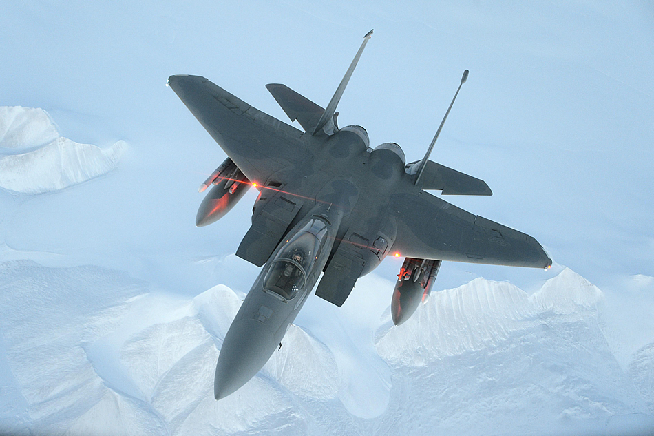An F-15C Eagle from the 144th Fighter Wing flies above the High Arctic Oct. 22, 2015. From Oct. 15-26, 2015, approximately 700 members from the Canadian Armed Forces and the U.S. Air Force, Navy, and Air National Guard deployed to Iqaluit, Nunavut, and 5 Wing Goose Bay, Newfoundland and Labrador, for Exercise Vigilant Shield 16. (U.S. Air National Guard photo/Master Sgt. David J. Loeffler)