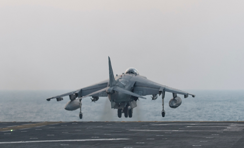 ARABIAN GULF (Nov. 19, 2015) An AV-8B Harrier assigned to Marine Medium Tiltrotor Squadron (VMM) 162 (Reinforced), 26th Marine Expeditionary Unit (26th MEU), launches from the amphibious assault ship USS Kearsarge (LHD 3) to conduct their first missions over Iraq in support of Operation Inherent Resolve. Kearsarge is deployed to the U.S. 5th Fleet, supporting Operation Inherent Resolve, the effort to degrade and ultimately destroy ISIL; maritime security operations; and regional theater security cooperation efforts. (U.S. Navy photo by Mass Communication Specialist Seaman Apprentice Ryre Arciaga)