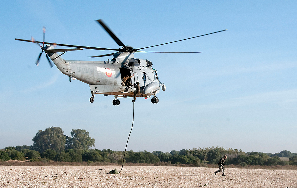 NAVAL STATION ROTA, Spain (Nov. 19, 2015) Members of Explosive Ordnance Disposal Mobile Unit 8, Detachment Rota, along with explosive ordnance disposal units from Spain and Germany, fast rope out of an SH-3 Sea King helicopter during Exercise Magre 2015-2 aboard Naval Station Rota, Spain Nov. 19, 2015. Exercise MAGRE is a tri-lateral counter improvised explosive device exercise involving Sailors from the U.S. Navy, German navy and hosted by the Spanish navy.(U.S. Navy photo by Krysta Murray)