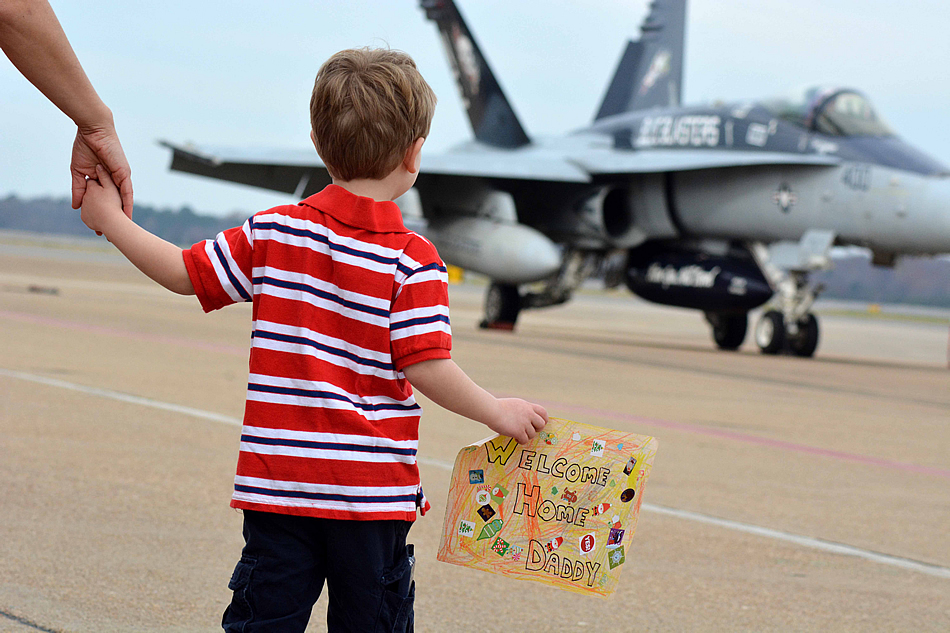 VIRGINIA BEACH, Va. (Dec. 13, 2015) A young boy awaits the arrival of his father, a Strike Fighter Squadron (VFA) 34 pilot, during a homecoming celebration at Naval Air Station Oceana. The Blue Blasters of VFA-34 were deployed aboard USS George Washington (CVN 73) for nearly four months. (U.S. Navy photo by Mass Communication Specialist 2nd Class Alysia R. Hernandez)