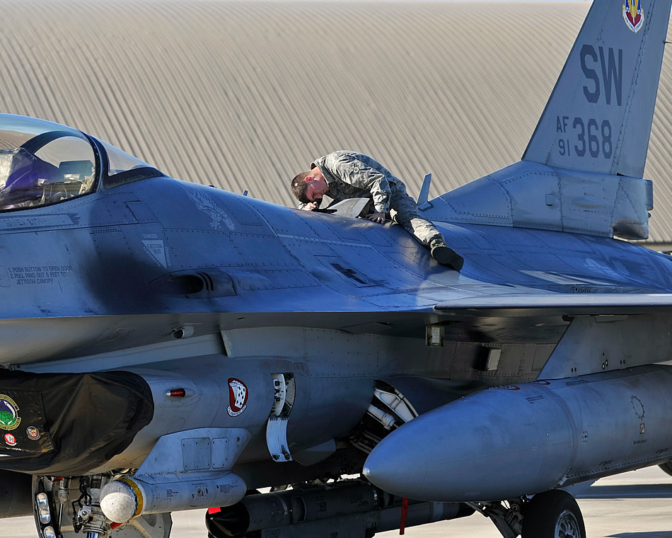 A 77th Aircraft Maintenance Unit dedicated crew chief from Shaw Air Force Base, S.C. performs maintenance on an F-16 Fighting Falcon Dec. 15, 2015, on the flightline at Tyndall AFB, Fla. The F-16 is a compact, multi-role fighter aircraft. It is highly maneuverable and has proven itself in air-to-air combat and air-to- surface attack. (U.S. Air Force photo/Senior Airman Sergio A. Gamboa)