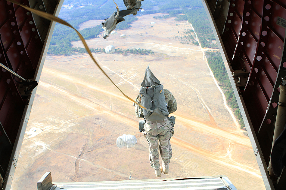 A U.S. Army paratrooper with U.S. Army John F. Kennedy Special Warfare Center and School (JFKSWCS), exits a U.S. Army CASA 212 at Fort Bragg, N.C., Jan. 11, 2016. Paratroopers with JFKSWCS conduct airborne operations in order to maintain proficiency in airborne operations. (Photo by Sgt. 1st Class Sean A. Foley)