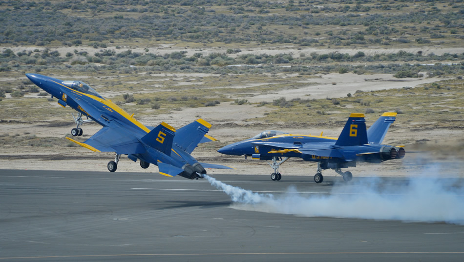 LANCASTER, Calif. (March 20, 2016) U.S. Navy Flight Demonstration Squadron, the Blue Angels, Lead Solo Pilot Lt. Ryan Chamberlain takes off along side Opposing Solo Pilot Capt. Jeff Kuss during the Los Angeles County Air Show. The Blue Angels are celebrating its 70th anniversary and are scheduled to perform 65 demonstrations at 34 locations across the U.S. in 2016. (U.S. Navy photo by Mass Communication Specialist 2nd Class Daniel M. Young)