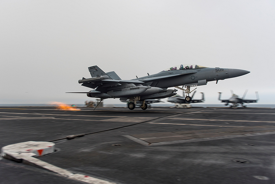 ARABIAN GULF (March 27, 2016) An EA-18G Growler assigned to the Patriots of Electronic Attack Squadron (VAQ) 140 lands on the flight deck of the aircraft carrier USS Harry S. Truman (CVN 75). The Harry S. Truman Carrier Strike Group is deployed in support of Operation Inherent Resolve, maritime security operations, and theater security cooperation efforts in the U.S. 5th Fleet area of operations. U.S. Navy photo by Mass Communication Specialist 2nd Class E. T. Miller