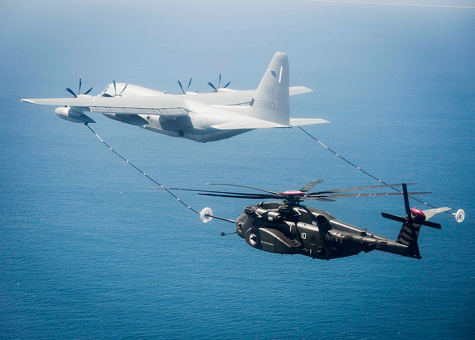 NORFOLK (March 30, 2016) An MH-53E Sea Dragon helicopter from the Blackhawks of Helicopter Mine Countermeasures Squadron (HM) 15 conducts an aerial refueling exercise with a Lockheed Martin KC-130 tanker. Navy and Marine Corps aviators regularly conduct training in order to maintain mission readiness. (U.S. Navy photo by Mass Communication Specialist 3rd Class Taylor N. Stinson)