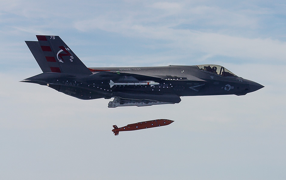 NAVAL AIR STATION PATUXENT RIVER, Md. (March 23, 2016) An F-35C Lighting II test aircraft piloted by Cmdr. Theodore Dyckman conducts the first separation of an AGM-154 Joint Stand-Off Weapon (JSOW) from an F-35 Joint Strike Fighter. (U.S. Navy photo by Dane Wiedmann)