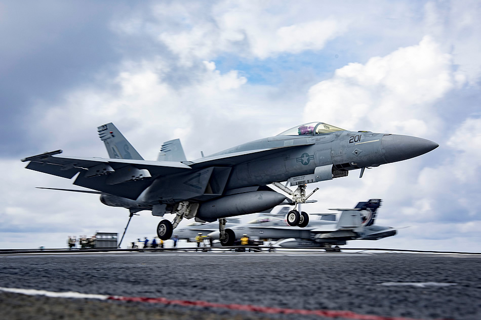 ATLANTIC OCEAN (June 2, 2016) An F/A-18E Super Hornet assigned to the Sidewinders of Strike Fighter Squadron (VFA) 86 prepares to make an arrested landing on the flight deck of the aircraft carrier USS Dwight D. Eisenhower (CVN 69). Dwight D. Eisenhower and its Carrier Strike Group (CSG) are deployed in support of maritime security operations and theater security cooperation efforts in the U.S. 5th and 6th Fleet areas of responsibility. (U.S. Navy photo by Mass Communication Specialist 3rd Class Anderson W. Branch)