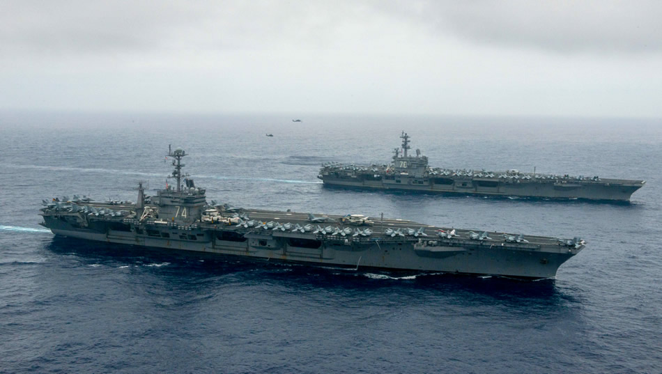 PHILIPPINE SEA (June 18, 2016) The Nimitz-class aircraft carriers USS John C. Stennis (CVN 74), center, and USS Ronald Reagan (CVN 76) conduct dual aircraft carrier strike group operations in the U.S. 7th Fleet area of operations in support of security and stability in the Indo-Asia-Pacific. The operations mark the U.S. Navy's continued presence throughout the area of responsibility. (U.S. Navy photo by Mass Communication Specialist 3rd Class Jake Greenberg)