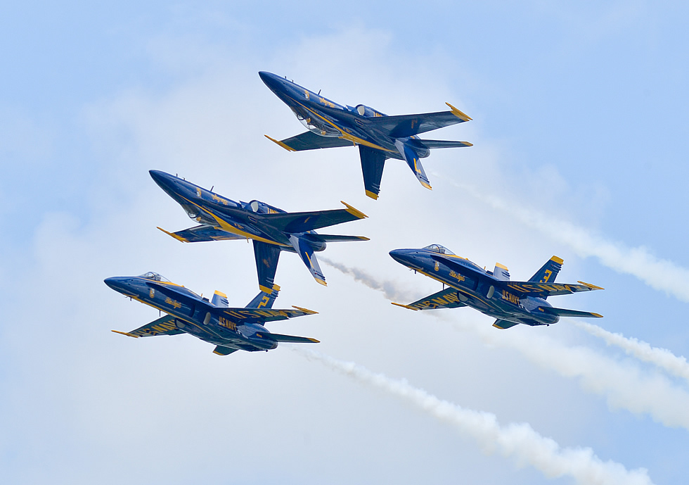 SIOUX FALLS, S.D. (July 22, 2016) U.S. Navy flight demonstration squadron, the Blue Angels, Diamond pilots perform the Double Farvel maneuver during a practice for the Sioux Falls Airshow, Power on the Prairie, July 22. The Blue Angels are scheduled to perform 58 demonstrations at 30 locations across the U.S. in 2016, which is the team's 70th anniversary year. (U.S. Navy photo by Mass Communication Specialist 1st Class Andrea Perez)
