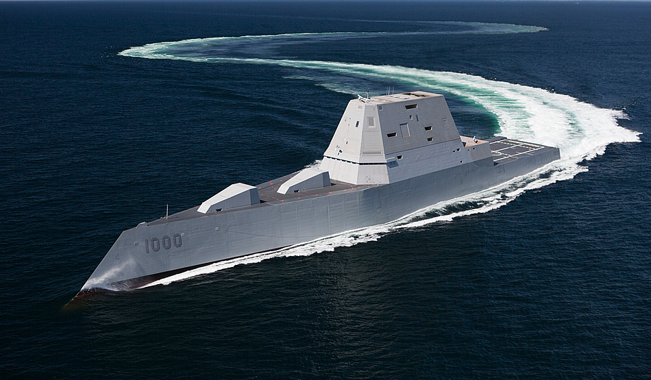 ATLANTIC OCEAN (April 21, 2016) The future guided-missile destroyer USS Zumwalt (DDG 1000) transits the Atlantic Ocean during acceptance trials April 21, 2016 with the Navy's Board of Inspection and Survey (INSURV). The U.S. Navy accepted delivery of DDG 1000, the future guided-missile destroyer USS Zumwalt (DDG 1000). Following a crew certification period and October commissioning ceremony in Baltimore, Zumwalt will transit to its homeport in San Diego for a Post Delivery Availability and Mission Systems Activation. DDG 1000 is the lead ship of the Zumwalt-class destroyers, next-generation, multi-mission surface combatants, tailored for land attack and littoral dominance. (U.S. Navy)