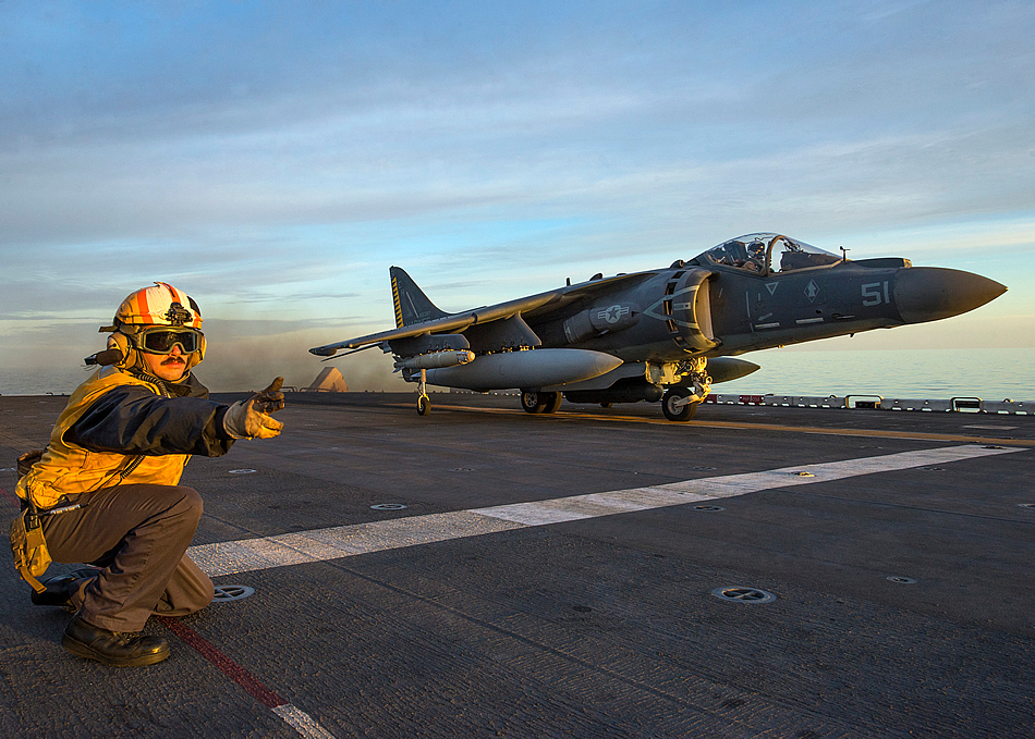 MEDITERRANEAN SEA (Dec. 5, 2016) An AV-8B Harrier, from the 22nd Marine Expeditionary Unit (MEU), takes off from the amphibious assault ship USS Wasp (LHD 1). The 22nd MEU, embarked on Wasp, is conducting precision air strikes in support of the Libyan Government aligned forces against Daesh targets in Sirte, Libya, as part of Operation Odyssey Lightning. (U.S. Navy photo by Petty Officer 2nd Class Nathan Wilkes)