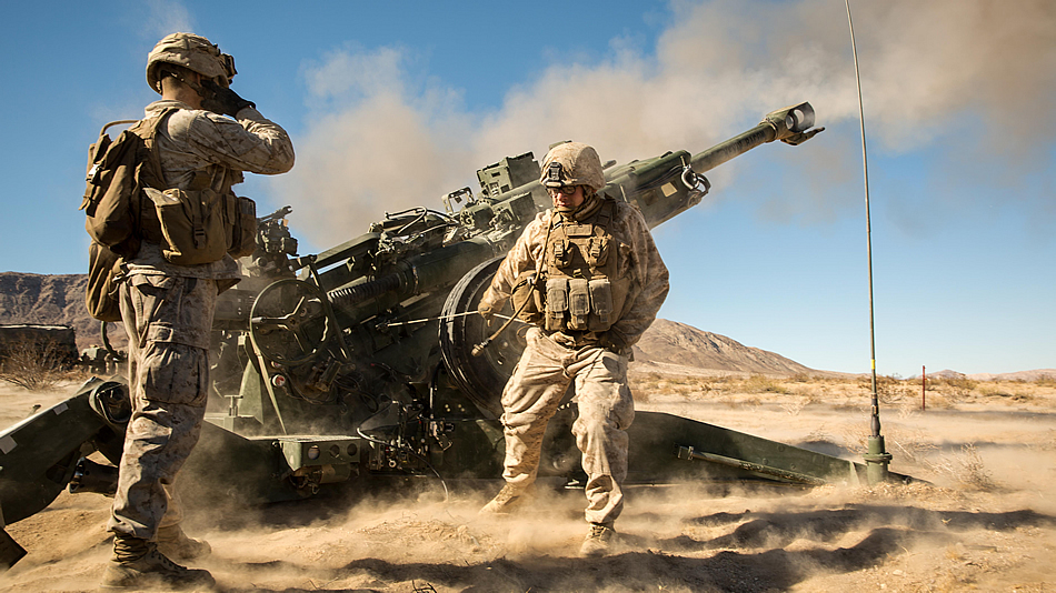 MARINE CORPS AIR GROUND COMBAT CENTER TWENTYNINE PALMS, California - Marines with Battery K, 3rd Battalion, 11th Marine Regiment, fire an M777A2 Howitzer in the Quackenbush Training Area aboard the Marine Corps Air Ground Combat Center, Twentynine Palms, Calif., Dec. 3, 2016, during the regiment’s “Top Gun” competition. Photo By: Cpl. Levi Schultz