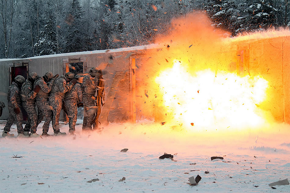 Paratroopers practice door breaching techniques during the Urban Mobility Breacher Course at Joint Base Elmendorf-Richardson, Alaska, Dec 13, 2016. They are with 6th Brigade Engineer Battalion, 4th Infantry Brigade Combat Team (Airborne), 25th Infantry Division. Photo by Spc. Donald Williams