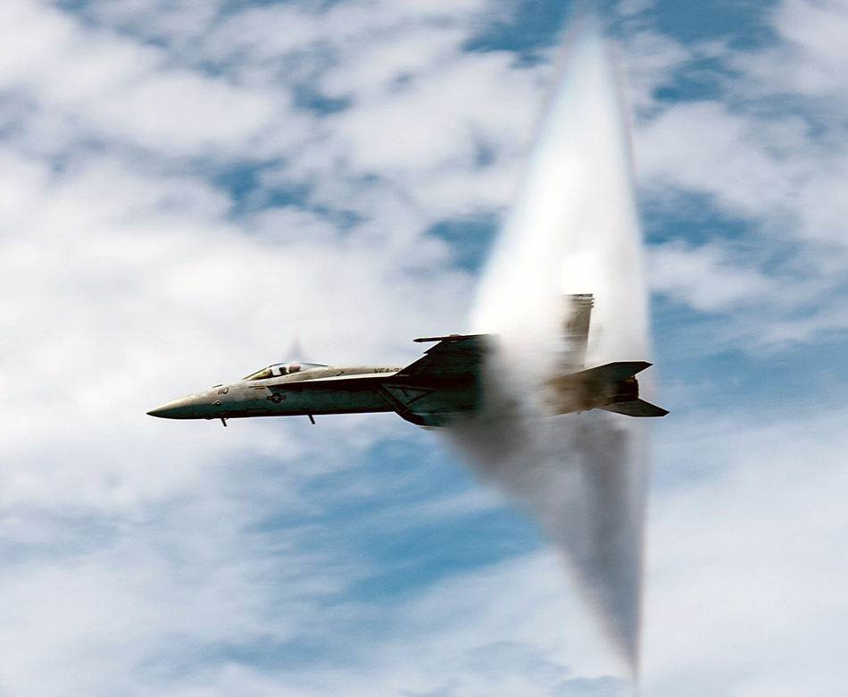 An F/A-18E Super Hornet breaks the sound barrier above the aircraft carrier USS George H.W. Bush during an air power demonstration over the Atlantic Ocean, Aug. 20, 2017. The ship and its carrier strike group are returning home from a seven-month deployment. Navy photo by Petty Officer 3rd Class Matt Matlage