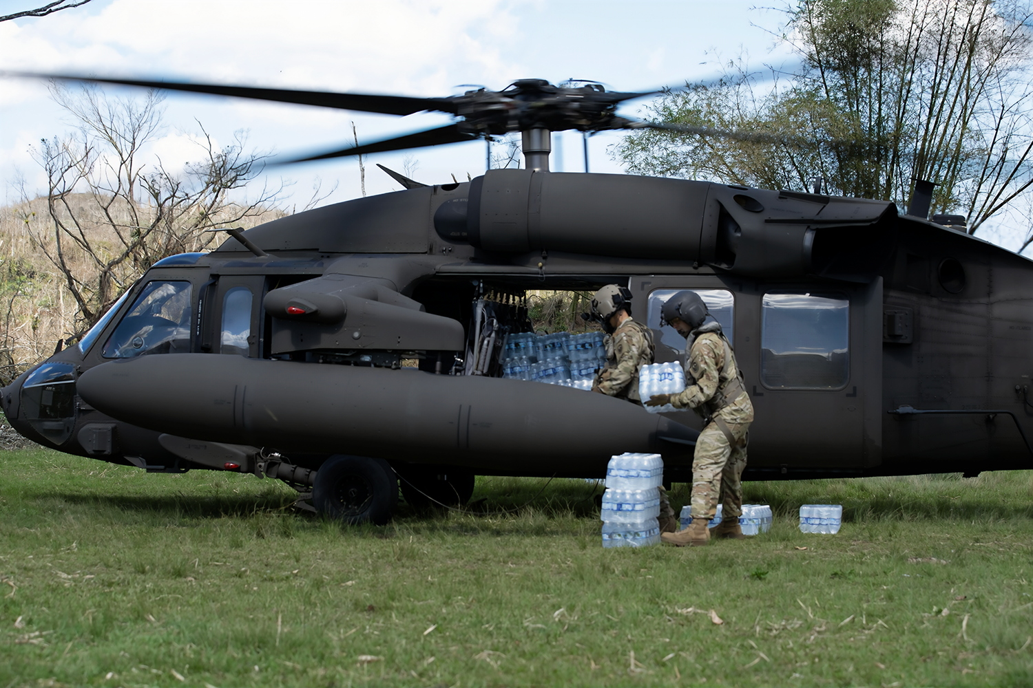 U.S. Army CPT. Jonathon Veliz, UH-60 Black Hawk pilot with the 1st Battalion 228th Aviation Regiment, Joint Task Force-Bravo and SPC Arthur Ferreira, 1-228, UH-60 Black Hawk crew chief, offload water at Bethel Town, Jamaica, Nov. 6, 2025. U.S. military forces are deployed to Jamaica at the direction of U.S. Southern Command to provide immediate, lifesaving assistance following Hurricane Melissa. (U.S. Air Force Photo by Staff Sgt. Alexander Merchak)